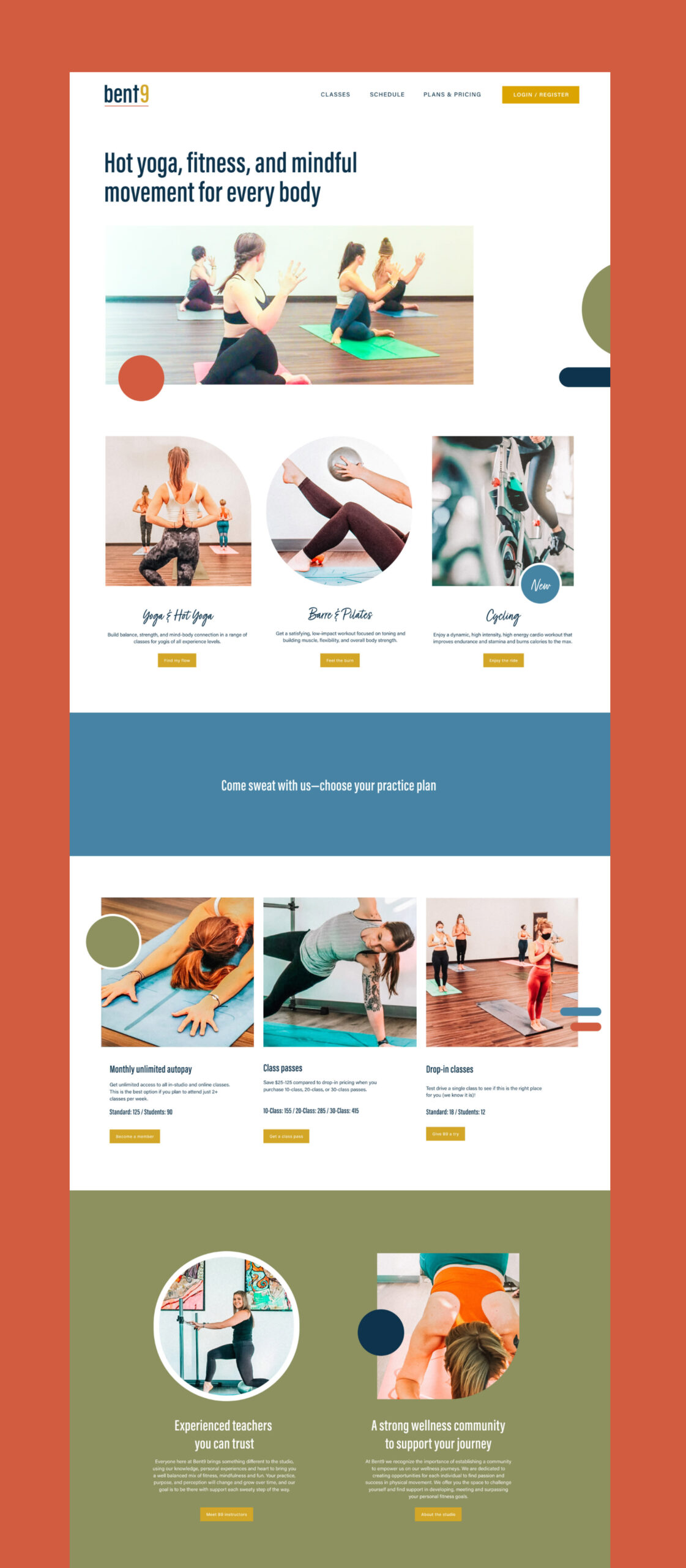 Bent9 is a yoga, barre, and fitness studio in Kalamazoo, Michigan with an inclusive approach and a belief that wellness should be for everyone. On the verge of opening a new cycling studio in their space, they came to Pair of Ducks for a website refresh to launch in style: