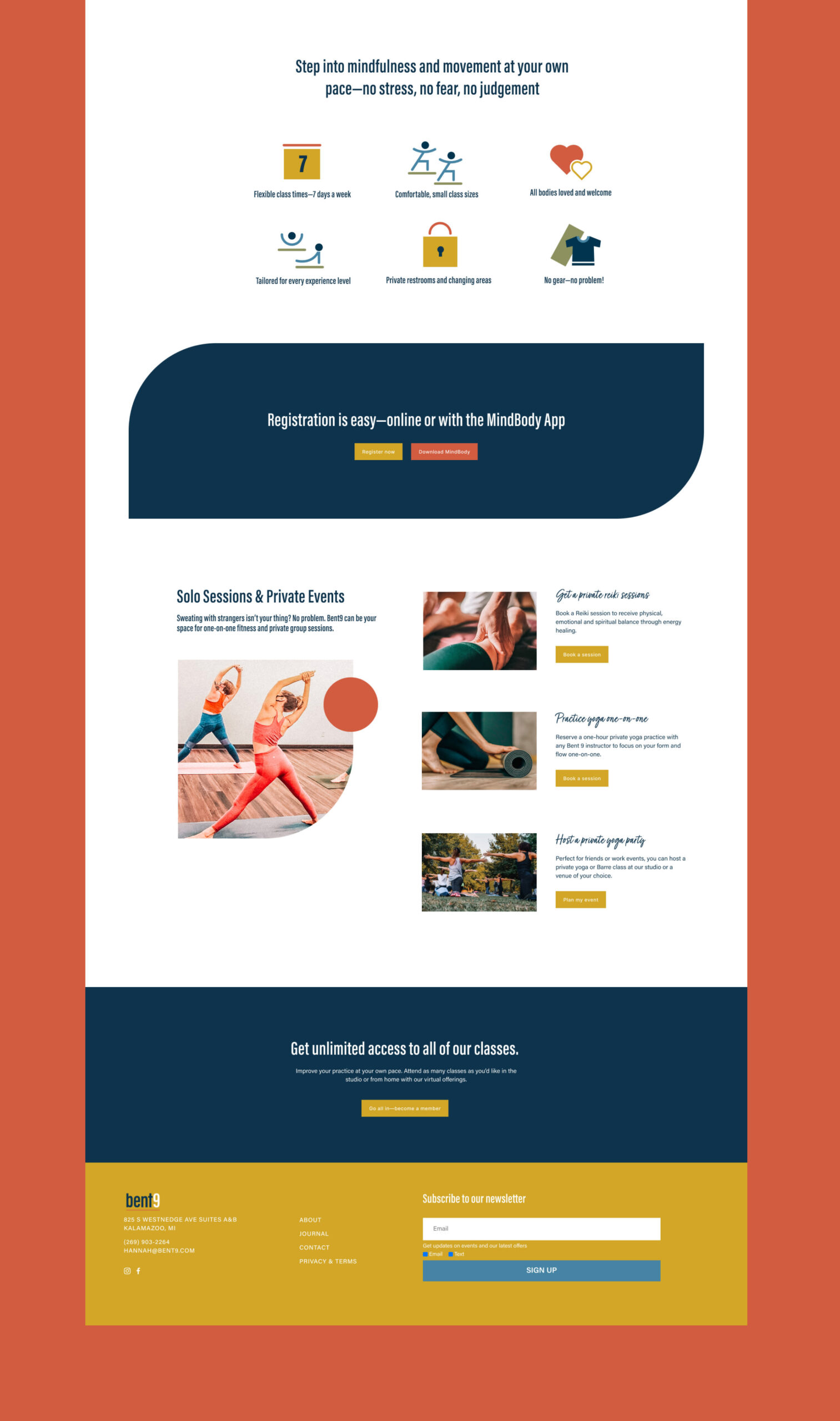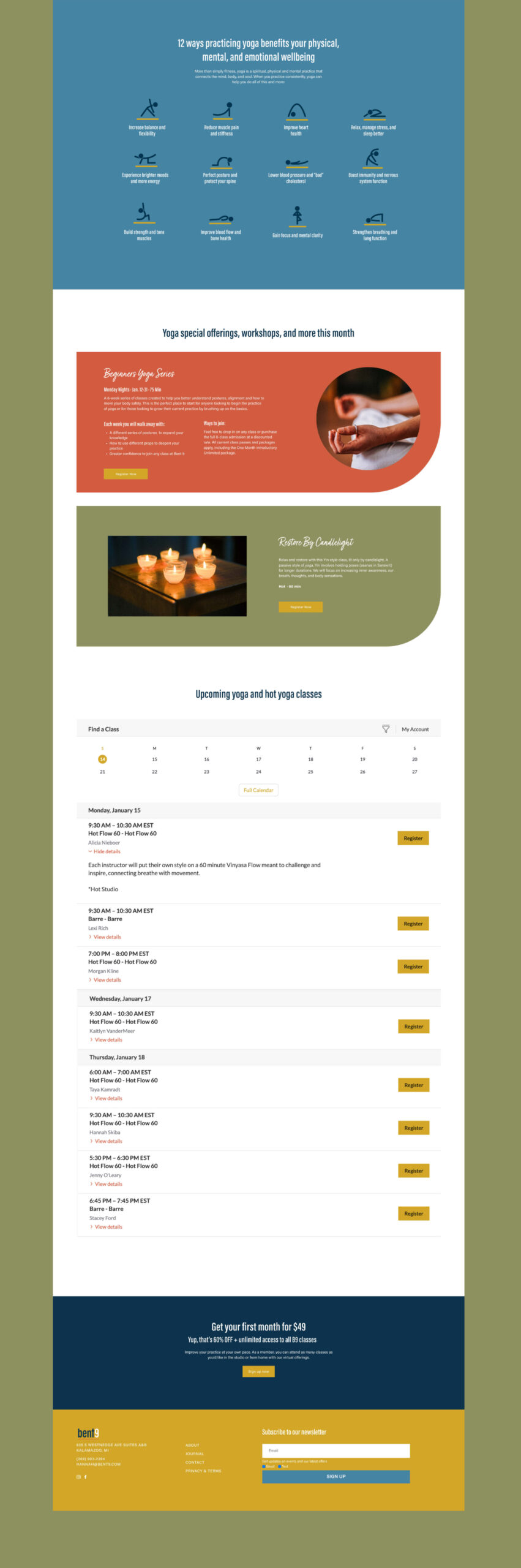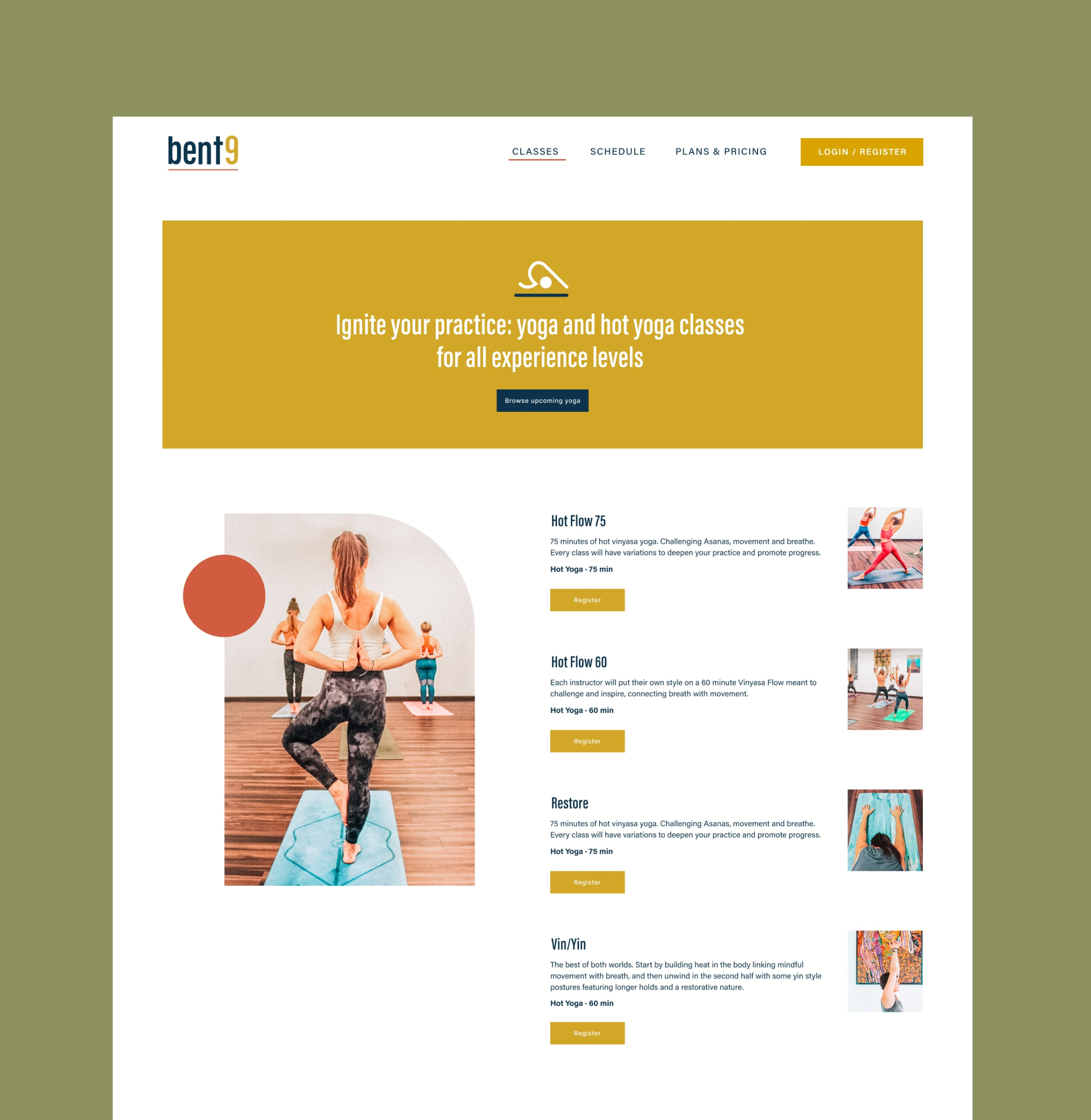 Bent 9’s registration MindBody software was integrated for easier class signup in less clicks and to display an up-to-date calendar of class times and schedules.