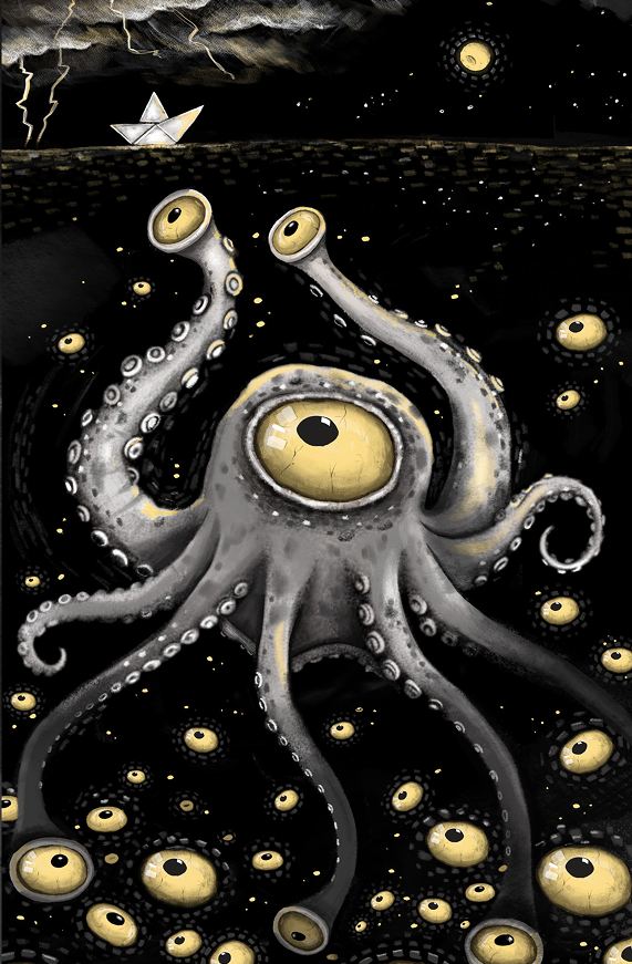 With the logo finalized, ideas with the Journeyman team started flowing, and everyone wanted to see their new creature come to life in the new brewery space. We got out our sketchbooks and came up with a monstrous and stormy scene.