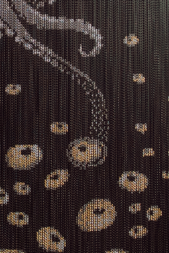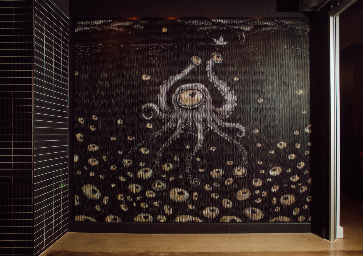 Then, we worked with a metal fabricator who turned our artwork into an oversized wall sculpture that is a focal point and an eye-catching photo op in the the Sea of Monsters entryway. The large-scale installation is made from thousands of colored metal links suspended like strips of chainmail.
